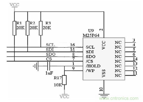 圖3為ARM與Flash的連接電路圖。以下幾點說明:(1)SCL串行時鐘信號,由主設(shè)備產(chǎn)生;(2)SDO主設(shè)備數(shù)據(jù)輸出,從設(shè)備數(shù)據(jù)輸入;(3)SDI主設(shè)備數(shù)據(jù)輸入,從設(shè)備數(shù)據(jù)輸出;(4)CS為片選,從設(shè)備使能信號,由主設(shè)備控制。(5)對7、15、16角外接上拉電阻,提高芯片輸入信號的噪聲容限增強抗干擾能力。