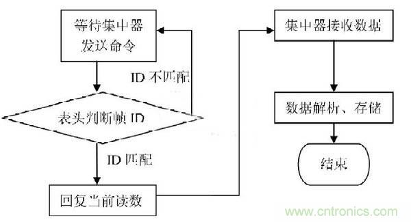 集中器發(fā)送CAN數(shù)據(jù)命令包到CAN總線,表頭根據(jù)各自的ID選擇接收讀表命令后發(fā)送應答數(shù)據(jù)到CAN總線上。