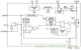 在外部電源模式下,通過連接變壓器輔助繞組或者輸出端(后者只有在非隔離型拓?fù)淝闆r下),可使VCC電壓保持在4.25V以上,高壓電流發(fā)生器始終處于關(guān)閉狀態(tài)。
