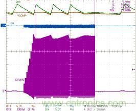 新的脈沖跨周調(diào)制模式保護(hù)功能可避免漏極電流過高和變壓器飽和,這兩種現(xiàn)象在轉(zhuǎn)換器啟動階段特別常見(圖5中的虛線),因?yàn)楫?dāng)輸入和輸出電壓差值很大時(shí),電壓時(shí)間開始失衡,如果不加以控制,IDRAIN將會迅速升高。