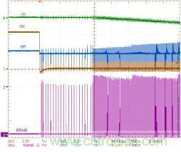 在啟動階段,若IDRAIN 在tONMIN時(shí)間內(nèi)升至較高值,則脈沖跨周調(diào)制模式激活,以降低芯片的開關(guān)頻率(圖9),為電感提供更多的放電時(shí)間,幫助限制漏極峰流值,防止電流失控現(xiàn)象發(fā)生,避免變壓器出現(xiàn)飽和,提高系統(tǒng)總體可靠性。