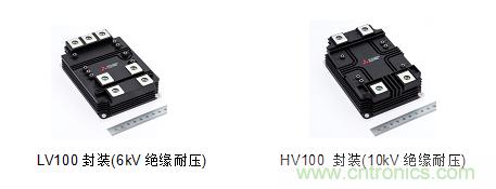 首次亮相展會的X系列雙管HVIGBT模塊,采用CSTBTTM 結(jié)構(gòu)的第7代IGBT和RFC二極管,降低功率損耗;運用可降低內(nèi)部電感的封裝技術(shù),優(yōu)化產(chǎn)品性能;使用兩種封裝(LV100/HV100),實現(xiàn)兩種絕緣耐壓(6kV/10kV),但兩者具有相同的外形尺寸。LV100封裝包括900A/1.7kV和450A/3.3kV;HV100封裝包括450A/3.3kV、330A/4.5kV和225A/6.5kV;可提高系統(tǒng)結(jié)構(gòu)設(shè)計的靈活性,方便實現(xiàn)逆變器擴容。