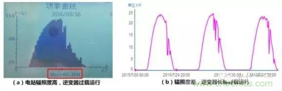 湖北某電站采用30kW組串式逆變器,由于所選逆變器的直流輸入能力不足,單臺(tái)逆變器直流側(cè)最大只能配置30kWp的組件,即容配比1:1。當(dāng)光照資源相對(duì)較差,即使在全年輻照最高時(shí),逆變器實(shí)際輸出功率也僅為25kW,如圖1(b)所示。逆變器及