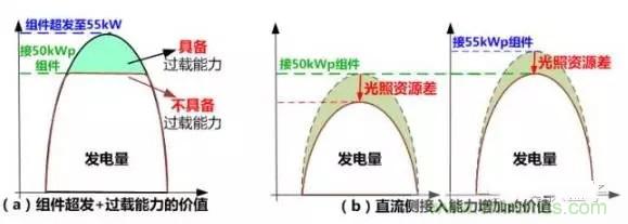 如正面案例所述,當(dāng)輻照度或溫度等環(huán)境條件變化時(shí),組件輸出功率會(huì)超過規(guī)格書中標(biāo)定的最大功率,即“組件超發(fā)”,此種情況通常發(fā)生在部分光照資源較好的部分Ⅰ類資源區(qū),這就要求逆變器需具備將組件能量全部轉(zhuǎn)化的能力,即對(duì)逆變器“吐”的能力要求較高。否則將會(huì)出現(xiàn)棄光的現(xiàn)象,降低發(fā)電量,影響用戶收益,如圖2(a)所示。