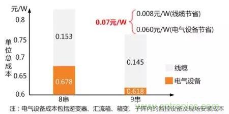 上述分析僅僅是考慮了光照資源,但在實(shí)際光伏系統(tǒng)中,由于灰塵遮擋,組件輸出至少降低2-3%,再考慮到組件衰減、電纜損耗等因素,實(shí)際傳輸?shù)侥孀兤鬏斎攵说闹绷鞴β视謺?huì)減少5-10%左右。此外,根據(jù)1.6MW典型系統(tǒng)設(shè)計(jì)方案成本計(jì)算表明,50kW組串式逆變器直流側(cè)接9串方案比8串方案,逆變器數(shù)量減少了12%以上,可節(jié)省系統(tǒng)初投資0.07元/W,100MW可節(jié)約初始投資700萬,這便是逆變器較高的“吞”能力帶來的好處,如圖3所示。