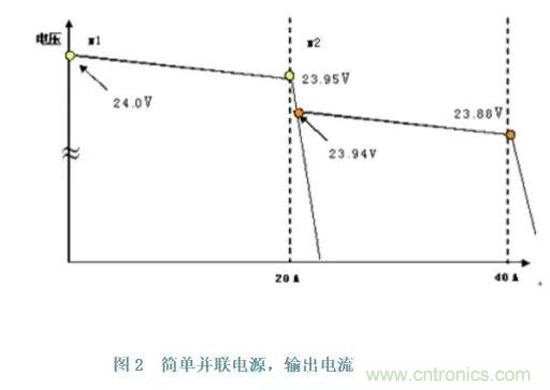 被動(dòng)式均衡電流的并聯(lián)運(yùn)行模式特點(diǎn)是:當(dāng)輸出電流增大時(shí),其輸出電壓會(huì)微量的減少,其輸出電壓是所謂的軟特性:輸出電壓隨著輸出電流的增加而稍微下降。其電源在空載到滿負(fù)載之間的輸出電壓的波動(dòng)大約為4%~5%額定電壓即1V左右。這樣當(dāng)二個(gè)電源并聯(lián)時(shí),由于不同的電流負(fù)載產(chǎn)生了不同的輸出電壓,一個(gè)是有稍高輸出的電壓的電源首先承受負(fù)載電流,隨著電流量的增加,這個(gè)電源輸出電壓略降,低于另一個(gè)電源的輸出電壓,這樣另一電源承受負(fù)載電流,通過(guò)這樣階梯式交替的方法達(dá)到均衡電流的作用。均衡電流的平衡程度如何,取決于所有并聯(lián)電源的輸出電壓的初始調(diào)節(jié)和設(shè)置值。必需指出,這個(gè)方法的實(shí)現(xiàn)其輸出電源必須采用一個(gè)共同的接線端。