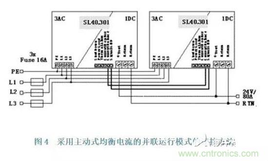 主動(dòng)式均衡電流的并聯(lián)模式必須采用一根附加的均流線,這根均流線作為反饋信號(hào)傳送到電源的控制器來(lái)調(diào)節(jié)每個(gè)電源在所有的條件下提供相同的輸出電流,這時(shí),電源電壓輸出的軟特征是不需要的,輸出電壓在任何場(chǎng)合下不受電流大小的影響,所以與被動(dòng)式均衡電流相比,其輸出電壓精度高,同時(shí)與輸出電路的類型無(wú)關(guān);但是對(duì)于開(kāi)發(fā)和安裝來(lái)說(shuō),費(fèi)用較高,因?yàn)樵陔娫磧?nèi)部需要一個(gè)精確度較高的電流測(cè)試線路和一個(gè)附加的電流調(diào)節(jié)器,同時(shí)也多一個(gè)接線端口。PULS電源的SL40.301三相24/40A的電源采用這種技術(shù),所有的電源經(jīng)過(guò)均流線和地線相連接,如圖4所示。
