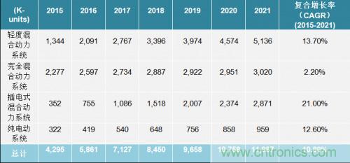如表1所示,每部車輛都可能搭載1到4個(gè)電機(jī)。(搭載4個(gè)電機(jī)是出于每個(gè)輪胎都需要一臺(tái)電機(jī))。每臺(tái)使用的電機(jī)都將需要搭配合適的系統(tǒng),以安全高效地驅(qū)動(dòng)與控制這些電機(jī)。這些系統(tǒng)需要具備控制可見(jiàn)性和粒度,以實(shí)現(xiàn)合適的扭矩與電機(jī)控制。牢記電機(jī)與其控制系統(tǒng)需要的知識(shí),表2(同樣來(lái)自Strategy Analytics的報(bào)告)給2015-2021期間市場(chǎng)上的每種類型車輛的數(shù)量一個(gè)估計(jì)值