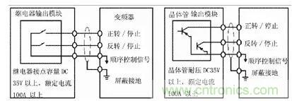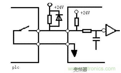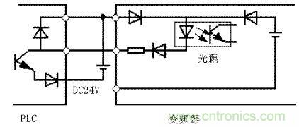 當(dāng)輸入開關(guān)信號進(jìn)入變頻器時,有時會發(fā)生外部電源和變頻器控制電源(DC24V)之間的串?dāng)_。正確的連接是利用PLC電源,將外部晶體管的集電極經(jīng)過二極管接到PLC。如圖4所示。