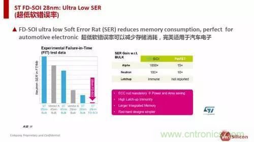 除了低功耗與低成本,F(xiàn)D-SOI工藝在可靠性上也表現(xiàn)出色。沈磊指出,從意法半導(dǎo)體給出的數(shù)據(jù)來看,由于FD-SOI工藝的敏感體積更小,對(duì)閂鎖效應(yīng)(latch-up)免疫,具備更低的SRAM軟錯(cuò)誤率,以及更好的電磁兼容性,使其更適用于高可靠應(yīng)用領(lǐng)域,例如汽車、銀行與生命維持系統(tǒng)等。