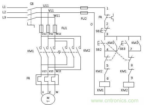 這張圖如果沒有編號6和編號9那兩個接觸器常閉觸點,和編號5和編號8那兩個機械互鎖按鈕的常閉觸點,就很好理解。即按下SB2,電動機正轉(zhuǎn),按下SB3,電動機反轉(zhuǎn)。