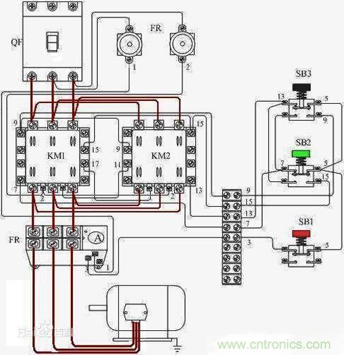 注意看左側(cè)的主回路,三項電L1,L2,L3通過接觸器KM1到達(dá)電動機M1的順序為左、中、右;而通過接觸器KM2到達(dá)電動機M1的順序為右、中、左。相序的改變實現(xiàn)了電機運轉(zhuǎn)方向的改變。這一用法用在電動汽車或電動三輪車上,即可實現(xiàn)倒車的功能。現(xiàn)在有一種更方便的元件,叫做“倒順開關(guān)”,其原理便是如此。