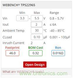 負(fù)載開關(guān)WEBENCH功能可通過產(chǎn)品頁(yè)面右側(cè)的WEBENCH組件實(shí)現(xiàn)。圖2顯示了TPS22965負(fù)載開關(guān)的組件。