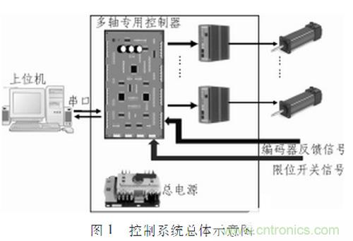 多軸控制器與上位機(jī)、電機(jī)驅(qū)動器等配合使用,圖1為采用多軸控制器組成的控制系統(tǒng)總體示意圖??刂破鹘邮丈衔粰C(jī)發(fā)送的控制指令,分析處理并產(chǎn)生相應(yīng)的方向信號、脈沖信號給驅(qū)動器,從而達(dá)到控制電機(jī)運行的目的。為了提高系統(tǒng)的控制精度,將電機(jī)的編碼器信號作為反饋信號輸入給控制器(內(nèi)部實現(xiàn)自動辨向及四細(xì)分)。在各軸運動過程中,專用控制器對電機(jī)運行的絕對位移進(jìn)行記錄,并且可以實時地將各軸的絕對位置信息上傳給上位機(jī)。另外在電機(jī)運行的過程中,為了保證電機(jī)運行的安全性,控制器還采用了限位信號反饋實現(xiàn)全硬件保護(hù)措施。