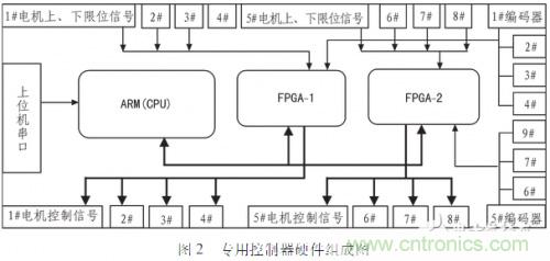 專用控制器由arm(LPC2214)、fpga(EP2C5T144C8)、驅(qū)動器接口電路、編碼器接口電路、限位檢測電路和電源電路等組成,如圖2為一個八軸電機(jī)控制器的硬件組成圖。arm通過串口實現(xiàn)與上位機(jī)之間的通信,解析從上位機(jī)獲得的控制指令,并通過fpga產(chǎn)生相應(yīng)輸出信號給驅(qū)動器接口,驅(qū)動器接口外接驅(qū)動器。編碼器信號作為位置反饋信號同編碼器接口相連,形成位置環(huán)反饋。限位信號作為安全檢測信號同限位檢測接口相連,為整個系統(tǒng)添加一道安全保障。