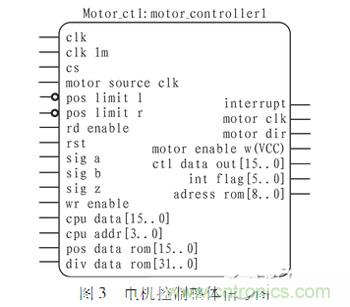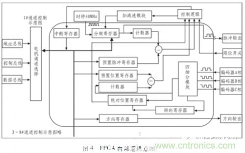 專用控制器在完成整個控制的過程中,arm只負(fù)責(zé)指令解析、控制指令發(fā)送、實時數(shù)據(jù)上傳等任務(wù),fpga才是多軸專用控制器的核心。通過Verilog HDL語言在fpga內(nèi)部實現(xiàn)了加減速曲線、編碼器信號辯向及四細(xì)分、絕對位移記錄等功能。圖3為電機(jī)控制的整體輸入、輸出信號圖,通過片選信號CS、讀有效信號rd_enable、寫有效圖信號wr_enable進(jìn)行電機(jī)通道選擇。圖4給出了1#通道控制的fpga內(nèi)部邏輯示意圖,下面將逐一對各主要模塊進(jìn)行詳細(xì)介紹。