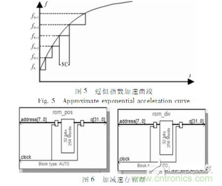為了更有效、更理想地控制電機(jī)的運行,在fpga內(nèi)部設(shè)計了加減速曲線模塊。文中采用了一種近似指數(shù)加減速曲線的方法,如圖5為近似指數(shù)加速曲線,減速曲線與之對稱。速度等距分布,那么在該速度級上保持的時間不一樣場。為了簡化,用速度級數(shù)N與一個常數(shù)C的乘積去模擬并且保持的時間用不熟來代替。因此,速度每升一級,電機(jī)都要在該速度級上走NC步(其中N為該速度級數(shù))。