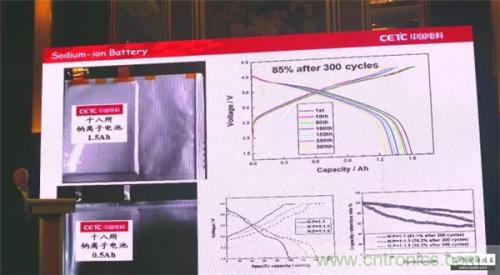 我們做了1.5Ah和0.5Ah兩種軟包全電池,正極材料采用前面提到的鎳錳氧化物,負極采用生物質的硬碳材料,經300次循環(huán)后容量衰降為15%。由此可見,鈉離子電池用廉價材料是可以制備的,而且電性能良好。