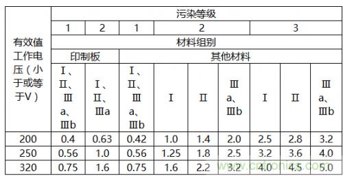 爬電距離是兩個導(dǎo)電體沿絕緣材料表面的最短距離,而最小爬電距離只由表格2N來確定;具體查表方法如下: