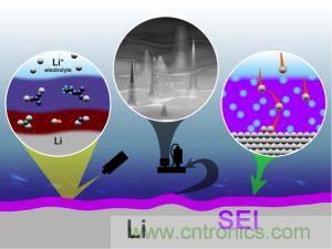 金屬鋰負極應用繞不開的是鋰枝晶的問題,早期人們對于鋰枝晶的認識主要來自于其他金屬電解過程中枝晶產(chǎn)生機理,對于鋰電池內(nèi)鋰枝晶形成機理更多是“猜測”。而在2014年,美國橡樹嶺國家實驗室的Robert L. Sacci等「2」利用原位透射電鏡技術直接在玻璃碳表面觀測到了鋰枝晶的形成過程,從下面的動畫可以看到,不同于傳統(tǒng)的枝晶的概念,鋰枝晶首先以球形出現(xiàn)的,其表面擁有一些納米球,這些納米球具有一定角度的小面,隨后的在一次鋰顆粒的表面進行的二次結(jié)晶生長,會產(chǎn)生許多其他形狀的鋰晶體,如球形、多面體和針狀等。