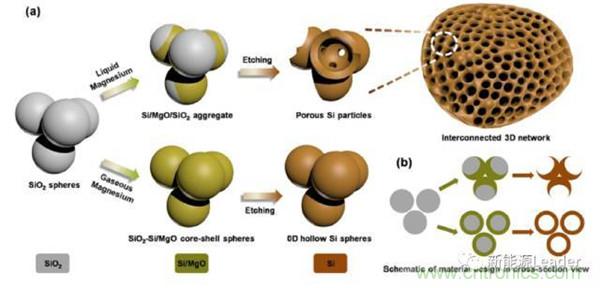 晶體Si的優(yōu)勢是容量高,首效高,缺點是體積膨脹大,為了克服這一問題,工業(yè)上一般是將晶體Si制成納米顆粒,分散在石墨之中,利用石墨吸收Si的體積膨脹。也可以將Si材料制成特殊形狀,例如Si納米線,蜂巢狀Si等。浙江大學的Hao Wu等「4」利用鎂熱反應制成了蜂窩狀的硅材料,如下圖所示,獨特的蜂窩狀結(jié)構(gòu)能夠很好的吸收Si的體積膨脹,顯著改善了循環(huán)性能,循環(huán)800次容量仍然可達1058mAh/g,容量保持率為91%。