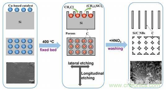 將Si材料與石墨復合也是克服Si體積膨脹的重要途徑,也是目前唯一上也化運用的方法。來自中科院過程所的Wenfeng Ren等[5]提出了一中新型的Si-C樹枝狀復合結(jié)構(gòu),如下圖所示。該方法首先在工業(yè)級多晶硅的表面分散一層銅基催化劑,然后在CH3Cl氣氛下,利用該催化劑對Si基體進行腐蝕,最終獲得樹枝狀的Si材料,這些Si晶體之間的空隙能夠很好的吸收體積膨脹,同時CH3Cl分解后會在Si表面形成一層無定形碳對Si形成保護,該材料在50mA/g的電流密度下,比容量可以達到849mAh/g,并具有良好的循環(huán)性能。