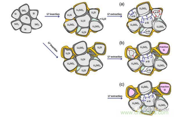同樣來自韓國的Insoo Choi等[7]還對SiOX失效機理進行了分析,實驗中Insoo Choi發(fā)現(xiàn),Si/SiOX/C復合電極的失效模式分為兩類,一類是局部實效,一類是全面實效。局部失效主要是在充放電過程中Si/SiOX反復膨脹,SEI膜變厚,導致活性物質(zhì)顆粒與導電網(wǎng)絡失去連接,部分嵌鋰的Si顆粒不再參與到充放電反應之中,導致電池容量的衰降。全局失效模式主要是因為粘結(jié)劑失效等原因,導致負極粉化掉料,引起活性物質(zhì)損失。