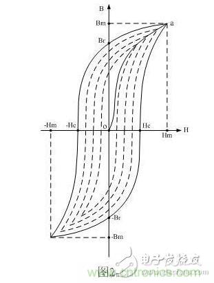 從圖2-16可以看出,當(dāng)變壓器鐵芯中不存在磁化場時,H和B均為零,即圖2-16中B~H曲線的坐標原點0。隨著磁場強度H的增加,磁通密度B也隨之增加,但兩者之間不是線性關(guān)系。當(dāng)H增加到一定值時,B不再增加(或增加十分緩慢),這說明該變壓器鐵芯的磁化已接近飽和狀態(tài)。一般人們都把Hm和Bm分別稱為最大磁場強度和最大磁通密度(對應(yīng)于圖中a點);而把Hs和Bs分別稱為飽和磁場強度和磁通密度。