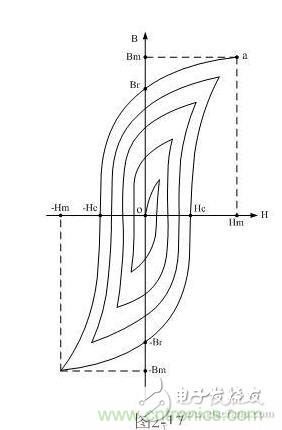 如果再使H逐漸退到零,則與此同時B也逐漸減少。然而H和B對應(yīng)的曲線軌跡并不沿原曲線軌跡a-0返回,而是沿另一曲線下降到Br,這說明當(dāng)H下降為零時,鐵磁物質(zhì)中仍保留一定的磁性,這種現(xiàn)象稱為磁滯,Br稱為剩磁。將磁場反向,再逐漸增加其強度,直到H=-Hc,磁通密度消失,這說明要消除剩磁,必須施加反向磁場Hc。Hc稱為矯頑力。它的大小反映鐵磁材料保持剩磁狀態(tài)的能力。圖2-16表明,當(dāng)磁場按Hm→0→-Hc→-Hm→0→Hc→Hm次序變化時,B所經(jīng)歷的相應(yīng)變化為Bm→Br→0→-Bm→-Br→0→Bm。于是得到一條閉合的B~H曲線,稱為磁滯回線。所以,當(dāng)鐵磁材料處于交變磁場中時(如變壓器中的鐵芯),它將沿磁滯回線反復(fù)被磁化→去磁→反向磁化→反向去磁。在此過程中要消耗額外的能量,并以熱的形式從鐵磁材料中釋放,這種損耗稱為磁滯損耗。前面已經(jīng)證明,磁滯損耗與磁滯回線所圍面積成正比。