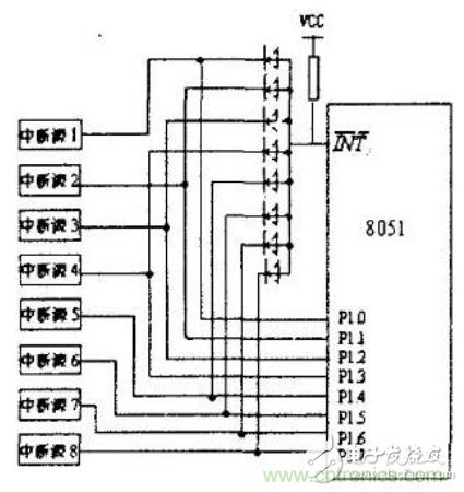 擴展的8個外部中斷源均通過二極管向I N T(x=0或I)請求中斷。當某個外部中斷源請求中斷服務時輸出低電平,單片機的I NT 經(jīng)二極管接地電平,單片機滿足響應外部中斷(I N T)請求條件,響應中斷,程序立即轉(zhuǎn)向I NT 對應的中斷入口地址處開始執(zhí)行中斷服務程序,通過軟件查詢PI.0~P1.7口外中斷源的狀態(tài),以識別提出請求的外擴中斷源,并轉(zhuǎn)向中斷服務程序為其服務,其查詢順序即為外部擴展中斷源的中斷優(yōu)先級順序。在圖中,是選用PI.0~PI.7作為外擴中斷源請求的狀態(tài)信息輸入端口。