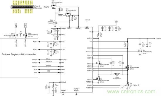NCP81239支持寬輸入電壓范圍,提供從150 kHz至1.2 MHz動態(tài)可編程的開關(guān)頻率,集成4個MOSFET驅(qū)動,采用雙沿電流模式控制,支持輸出預(yù)偏置啟動,自適應(yīng)死區(qū)時間控制防止直通,具有獨(dú)立的輸入和輸出電流檢測,輸出電壓(范圍0至20V)可以通過I2C 編程,集成過壓、欠壓、過流和精確的過載保護(hù)等完善的保護(hù)功能,同時還提供對5 V Vconn電源的保護(hù)。