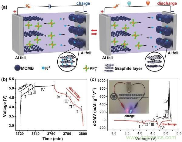 近日,中科院深圳先進(jìn)技術(shù)研究院唐永炳研究員(通訊作者)課題組在Adv. Energy Mater.上發(fā)表了一篇名為“A Dual-Carbon Battery Based on Potassium-Ion Electrolyte”的文章。研究人員開發(fā)了基于鉀離子電解液的新型雙碳電池(命名為K-DCB),其中中間相碳微球作為負(fù)極材料,膨脹石墨作為正極材料。實(shí)驗(yàn)人員研究了K-DCB的工作機(jī)理:充電時(shí),K+運(yùn)動(dòng)到石墨負(fù)極并嵌入到石墨層間形成插層化合物,同時(shí)PF6-運(yùn)動(dòng)到正極,插層到中間相碳微球的層間;放電時(shí)則相反。結(jié)果表明,該K-DCB在3.0~5.2V的電壓窗口范圍,1C的電流密度下可以提供61mAh g-1的可逆比容量,并且具有良好的循環(huán)性能,循環(huán)100次后容量幾乎無衰減。此外,該K-DCB具有較高的放電中值電壓(4.5V),能夠滿足一些高電壓設(shè)備的要求。K-DCB具有環(huán)保、成本低、能量密度高等優(yōu)點(diǎn),對(duì)未來能源儲(chǔ)存應(yīng)用極具潛力。