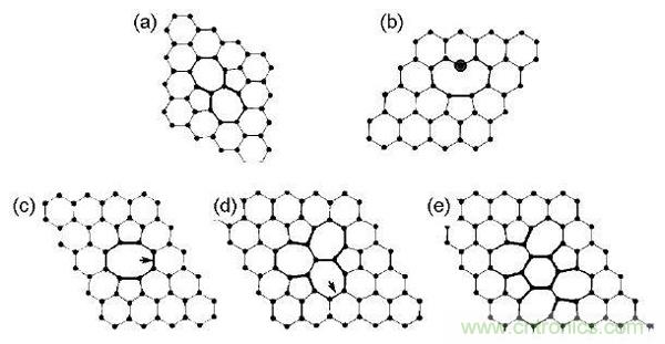 圖2.不同種類(lèi)石墨烯缺陷:(a)S-W缺陷;(b)V1缺陷;(c)585-V2缺陷;(d) 555777-V2 缺陷;(e) 555-6-777-V2缺陷