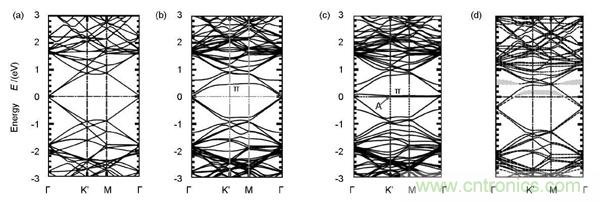 圖3.不同類(lèi)型石墨烯能帶結(jié)構(gòu):(a)完整石墨烯;(b)585-V2缺陷;(c)S-W缺陷;(d)N 石墨烯
