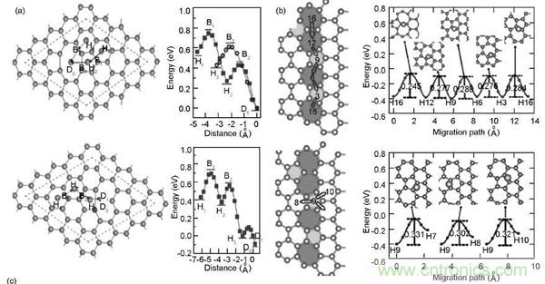 在鋰離子電池系統(tǒng)中,石墨烯除能夠存儲(chǔ)Li之外,還有一個(gè)重要的考察因素是石墨烯對(duì)Li離子擴(kuò)散過(guò)程的影響,這直接影響鋰離子電池的快速充放電行為。擴(kuò)散過(guò)程包括兩方面,Li在石墨烯表面上并以與表面平行的方向進(jìn)行擴(kuò)散,另外一種是穿過(guò)石墨烯平面,以與平面垂直的方向擴(kuò)散。