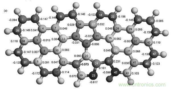 科學(xué)家使用團(tuán)簇結(jié)構(gòu)的石墨烯模型研究了含N石墨烯在酸性環(huán)境中對(duì)O2的催化機(jī)理。計(jì)算表明,OOH吸附在靠近吡啶結(jié)構(gòu)N的C原子上,其中一個(gè)O與C原子相互作用,并且該C原子從石墨烯平面伸出。對(duì)于吡咯N,OOH同樣會(huì)吸附在靠近N 的C原子上。當(dāng)在OOH上進(jìn)一步增加H后,吡啶N和吡咯N石墨烯上都會(huì)形成不穩(wěn)定的HOOH,O—O鍵長(zhǎng)增加,容易變成兩個(gè)OH,所以在N石墨烯上的ORR是四電子過(guò)程。同時(shí),作者提出自旋密度和電荷密度是決定催化效果的關(guān)鍵因素。盡管有的C電荷密度非常高,但是OOH更容易吸附在具有高自旋密度的C原子上。與電荷密度相比,自旋密度更能決定催化活性位,只有當(dāng)自旋密度非常小時(shí)電荷密度才起作用。圖9給出了所計(jì)算的摻N石墨烯上電荷密度和自旋密度分布。