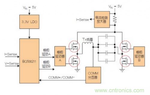 Qi發(fā)射器控制器擁有輸入功率限制選項(xiàng),至發(fā)射器的輸入電流可被限制在500mA,從而允許通過USB端口或小型電源適配器供電運(yùn)行。bq500211發(fā)射器的穩(wěn)壓電路有3.3V的LDO穩(wěn)壓器構(gòu)成輸出芯片供電,LDO的最大優(yōu)勢就是PNP管只會帶來很小的導(dǎo)通壓降,滿載的跌落電壓的典型值小于500mV,輕載時的壓降僅有10~20mV。LDO的壓差為:Vdrop = Vsat (LDO 穩(wěn)壓器)。