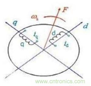 當(dāng)圖1和2的兩個(gè)旋轉(zhuǎn)磁動(dòng)勢大小和轉(zhuǎn)速都相等時(shí),即認(rèn)為圖2的兩相繞組與圖1的三相繞組等效。圖3兩個(gè)匝數(shù)相等且互相垂直的繞組d 和q,其中分別通以直流電流id和iq,產(chǎn)生合成磁動(dòng)勢F,其位置相對于繞組來說是固定的。如果讓包含兩個(gè)繞組在內(nèi)的整個(gè)鐵心以同步 轉(zhuǎn)速旋轉(zhuǎn),則磁動(dòng)勢F自然也隨之旋轉(zhuǎn)起來,成為旋轉(zhuǎn)磁動(dòng)勢。把這個(gè)旋轉(zhuǎn)磁動(dòng)勢的大小和轉(zhuǎn)速也控制成與圖1 和圖2中的磁動(dòng)勢一樣,那么這套旋轉(zhuǎn)的直流繞組也就和前面兩套固定的交流繞組都等效了。