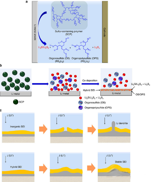 a) SCP提供電解質(zhì)中的有機(jī)單元(多硫化物/多巨硫化合物)和無機(jī)單元(Li2S/Li2S2);