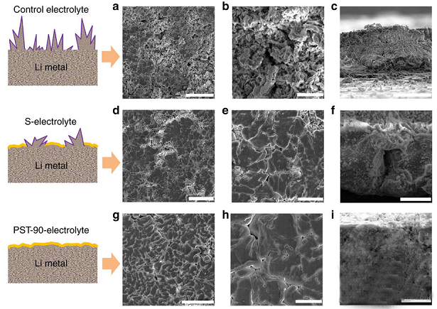 ?。?/font>g–i) 在PST-90的電解質(zhì)中沉積在裸露的不銹鋼襯底上的金屬Li的SEM圖;