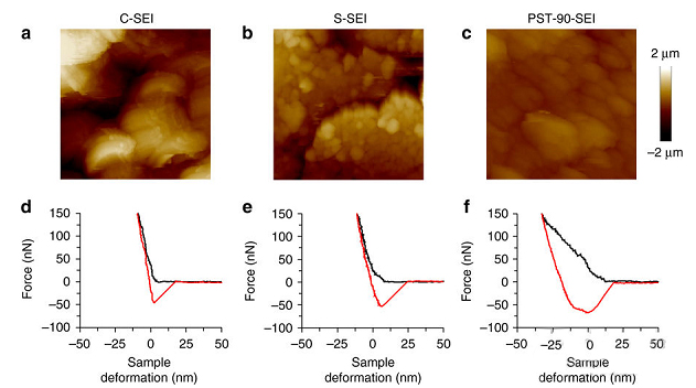 圖4. 由不同的電解質(zhì)形成的SEI層的表面形態(tài)和機(jī)械性能