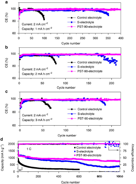 a)在2 mA cm-2的電流密度1 mA h cm-2的沉積能力下采用PST-90-電解質(zhì)的電池循環(huán)性能;
