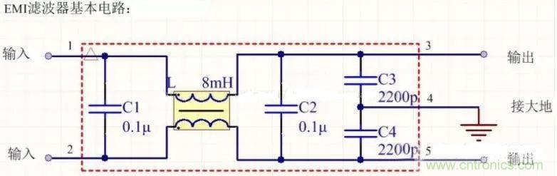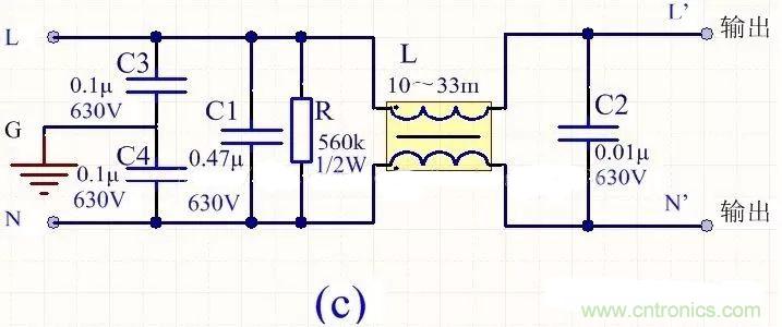 為降低成本和減小體積,開(kāi)關(guān)電源一般采用簡(jiǎn)易的EMI濾波器,主要包括共模扼流圈L和濾波電容,以下四種可以根據(jù)情況進(jìn)行選擇: