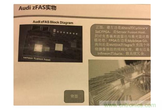 由于目前融合多是雷達與攝像頭融合,所需要的帶寬,一般的ASIC都能夠滿足。但是要融合激光雷達,則最好用FPGA,F(xiàn)PGA做傳感器Hub是最合適不過的。同時傳感器融合目前應(yīng)用較少,合適的ASIC并不好找,F(xiàn)PGA成為主流選擇。同時,對一些精度要求較高的雷達,如使用單精度浮點處理實現(xiàn)一個4096點FFT,采樣點越多,誤差就越小,但運算量會大幅度增加。它在每個時鐘周期輸入輸出四個復(fù)數(shù)采樣。每個FFT內(nèi)核運行速度超過80 GFLOP,這一般需要FPGA才能比較好的實現(xiàn)。一般車載雷達的采樣點在512-2048左右,但軍用的可以達到8192,必須配備FPGA。如下圖在AudizFAS的實物中,采用了Altera的CycloneV SoCFPGA,作為sensor fusion,同時負責毫米波雷達與激光雷達數(shù)據(jù)處理。