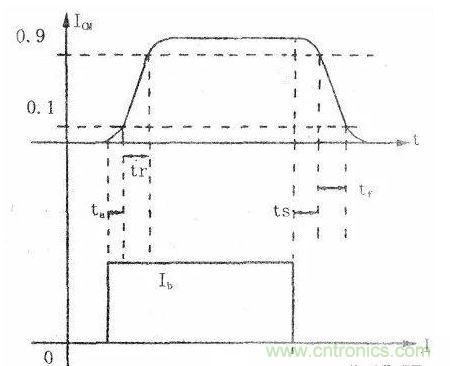 為了研究三極管開/關(guān)此瞬間過程,首先對(duì)開/關(guān)的相對(duì)值作一規(guī)定,即當(dāng)集電極電流達(dá)到其最大飽和電流90%時(shí),認(rèn)定它已接通,而集電極電流下降為I。的10%時(shí),認(rèn)為它已經(jīng)斷開。按此標(biāo)準(zhǔn)計(jì)量,三極管開/關(guān)過程所需時(shí)間作為衡量三極管的開關(guān)特性的比較標(biāo)準(zhǔn)。