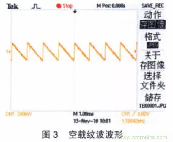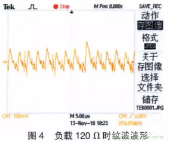 圖3 所示為空載時MAX606 輸出電壓紋波波形(Uo≈12 V),即開關(guān)紋波,其頻率為1.18 kHz,波形穩(wěn)定,Vpp=240 mV。圖4 所示為負(fù)載120 Ω 時輸出電壓的紋波波形,從圖4 中可以看出加入負(fù)載后電源紋波變得比較復(fù)雜,其最高Vpp達(dá)到1.2 V。為系統(tǒng)供電時,該紋波將會對系統(tǒng)造成嚴(yán)重危害,必須對此紋波進行抑制。