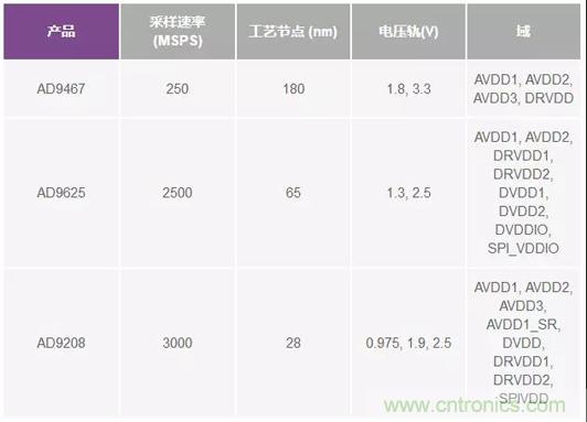 數(shù)字電路不需要裕量,因為最重要的參數(shù)是速度。所以,數(shù)字電路通常以最低電源電壓運行,以獲取CMOS開關(guān)速度和功耗的優(yōu)勢。這在新一代ADC中很明顯,最低電壓軌已降低至0.975 V。下面的表1列出了若干代的一些常見ADC。