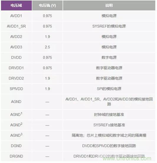 為了改善隔離,設(shè)計者必須考慮各種耦合機制。最明顯的機制是通過共享電源域。如果電源域盡可能遠離電路,那么共享同一電壓軌(AD9208為0.975 V)的數(shù)字電路和模擬電路發(fā)生震顫的可能性將非常小。在硅片中,電源已被分開,接地也是如此。封裝設(shè)計繼續(xù)貫徹了這種隔離電源域處理。由此所得的同一封裝內(nèi)不同電源域和地的劃分,如表2所示,其以AD9208為例。