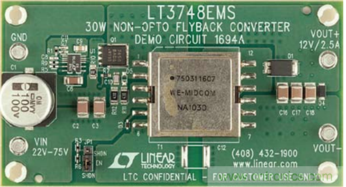 圖 3 示出了一款采用 LT3748 的演示電路板。該電路可接受一個范圍從 22V 至 75V 的 輸 入 電 壓, 并 在 高達(dá) 2.5A 的電流條件下產(chǎn)生一個隔離型12V 輸出。