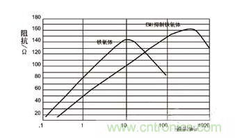 鐵氧體的效果隨著頻率的升高而增加。鐵氧體扼流圈的阻抗在10MHz處通常為幾十歐姆,當(dāng)頻率超過100MHz時(shí),阻抗升高到數(shù)百歐姆(具體值取決于形狀和尺寸,鐵氧體體積越大,阻抗越大)。不同廠家的產(chǎn)品或同一廠家的不同種類的鐵氧體,其阻抗隨頻率的變化都有所不同。圖5是尺寸相同(外徑為5mm,長度為11mm)但材料不同的兩種鐵氧體的特性。